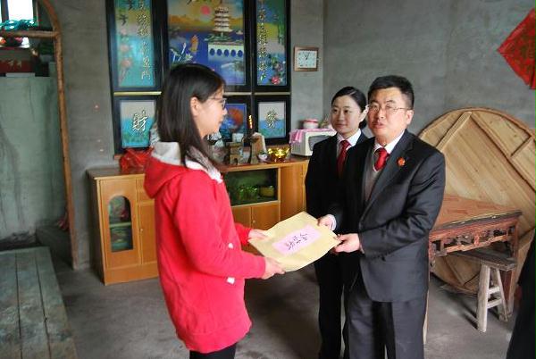 上午,刑庭一行人来到我院“院校共建”结对帮扶对象李丽君同学家中,在农历新年来临之际,为她送去我院捐资助学款二千元,并与李丽君同学促膝长谈,关心了解她近期的学习生活情况。