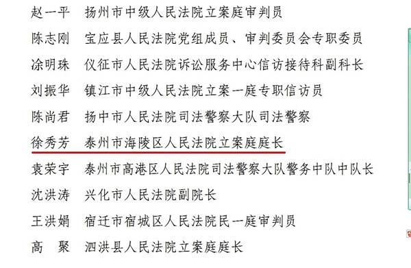 12月12日,省高院作出了《江苏省高级人民法院关于对全省法院党的十九大安保维稳工作先进集体和先进个人予以表扬的通报》,我院立案庭庭长徐秀芳同志被表彰为先进个人。