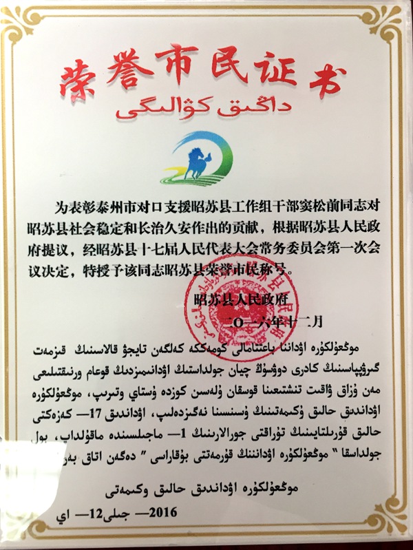 2016年6月,我院民二庭窦松前同志经组织委派,远赴四千多公里之外的新疆昭苏开展援疆工作。一年援疆工作期间,窦松前同志克服困难、无私奉献、勤奋工作、不负组织重托竭尽所能将内地先进的执法理念和超前的法院建设与昭苏本地实际相结合创造性地开展工作,为助推新疆社会稳定和长治久安做出了积极贡献,把昭苏当作第二故乡,把昭苏人民当作家乡人民,为泰昭两地法院搭建了交往交流交融的友谊桥梁 。窦松前同志为第二故乡新疆昭苏奉献了一片真情,挥洒了辛勤汗水。完成一年援疆任务之际,新疆昭苏县人民政府授予窦松前同志昭苏县荣誉市民称号,新疆维吾尔族自治区高级人民法院伊犁州分院为窦松前同志记个人三等功。
