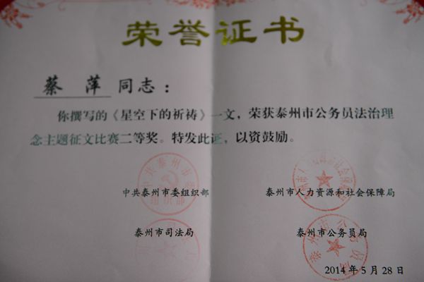 我院蔡萍法官撰写的《星空下的祈祷》一文,在荣获全区公务员法治理念主题征文比赛一等奖后,经区委组织部、区人事局共同推荐参加泰州市公务员法治理念主题征文比赛,喜获全市二等奖。