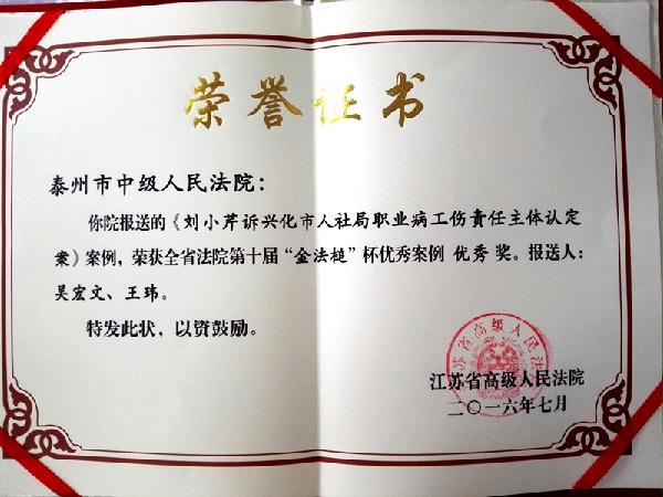 近日,江苏省高级人民法院发布《江苏省高级人民法院关于表彰全省法院第十届“金法槌”杯优秀案例、组织工作先进单位及优秀通讯编辑的决定》(苏高法[2016]142号)文件,我院报送的《刘小芹诉兴化市人社局职业病工伤责任主体认定案》(报送人:吴宏文、王玮)荣获优秀奖。