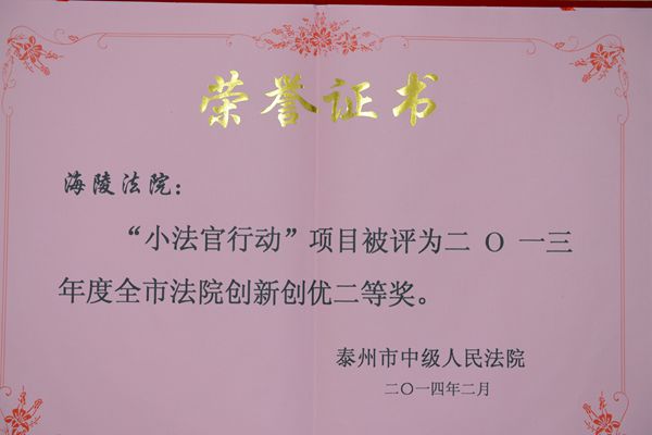 在2月13日召开的全市法院院长会议上,我院被市中院表彰为2013年度目标考核先进集体,我院“小法官行动”项目被评为2013年度全市法院创新创优二等奖。