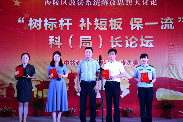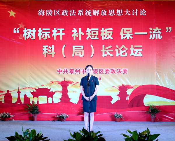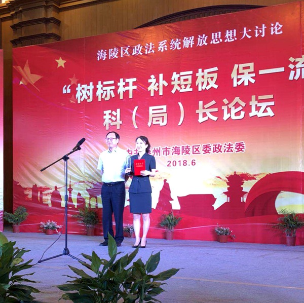 6月27日下午三点,由海陵区政法委组织的海陵区政法系统解放思想大讨论——“树标杆、补短板、保一流”科(局)长论坛在我院一号大法庭举行。我院刑庭庭长花艳获得本次比赛一等奖,民二庭庭长李虹获得优秀奖,我院获得优胜团体奖。
