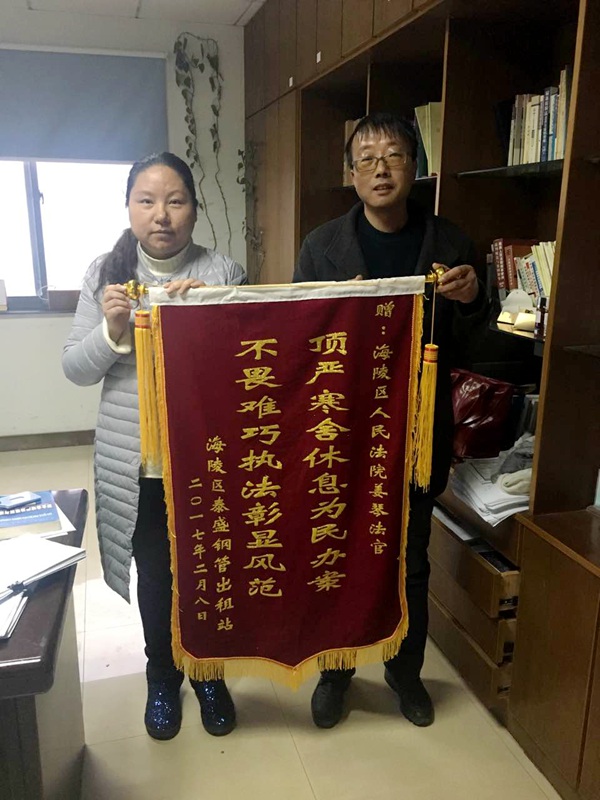 2017年新年伊始,申请执行人泰州市海陵区某钢管出租站的经营者袁某送来一面锦旗,锦旗上写着“顶严寒舍休息为民办案,不畏难巧执法彰显风范”。
