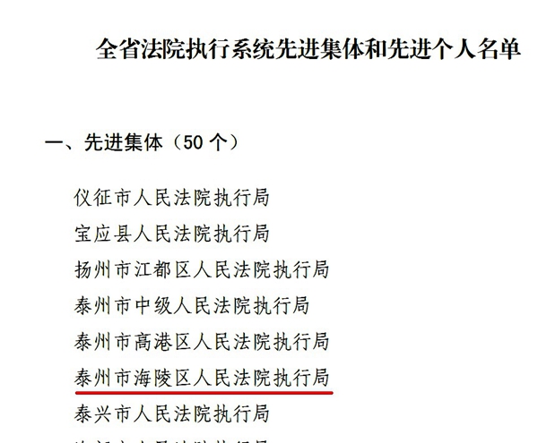 11月14日,省高院作出了《江苏省高级人民法院关于对全省法院执行系统先进集体和先进个人予以表扬的通报》,我院执行局被表彰为全省法院执行系统先进集体,执行局助理审判员王海宾同志被表彰为先进个人。